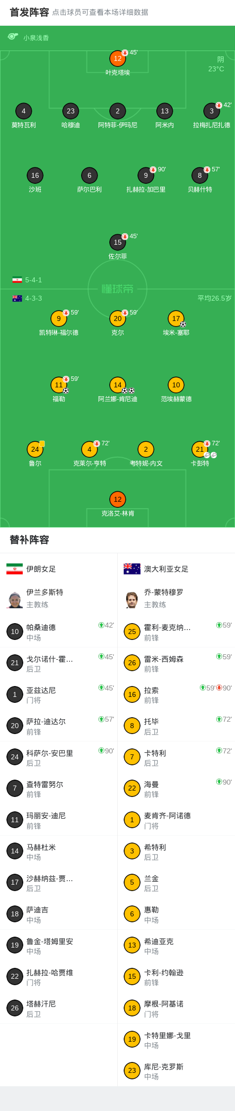 北京时间3月5日女足亚洲杯 小组赛 第2轮,伊朗女足对阵澳大利亚女足。澳大利亚女足埃米-塞耶破门,福勒破门,阿兰娜-肯尼迪梅开二度。最终比分伊朗女足 0-4 澳大利亚女足。精彩瞬间第8分钟,澳大利亚女足球员卡彭特助攻埃米-塞耶打入一球。第27分钟,澳大利亚女足球员福勒打入一球。第35分钟,澳大利亚女足球员阿兰娜-肯尼迪打入一球。第59分钟,澳大利亚女足球员卡...